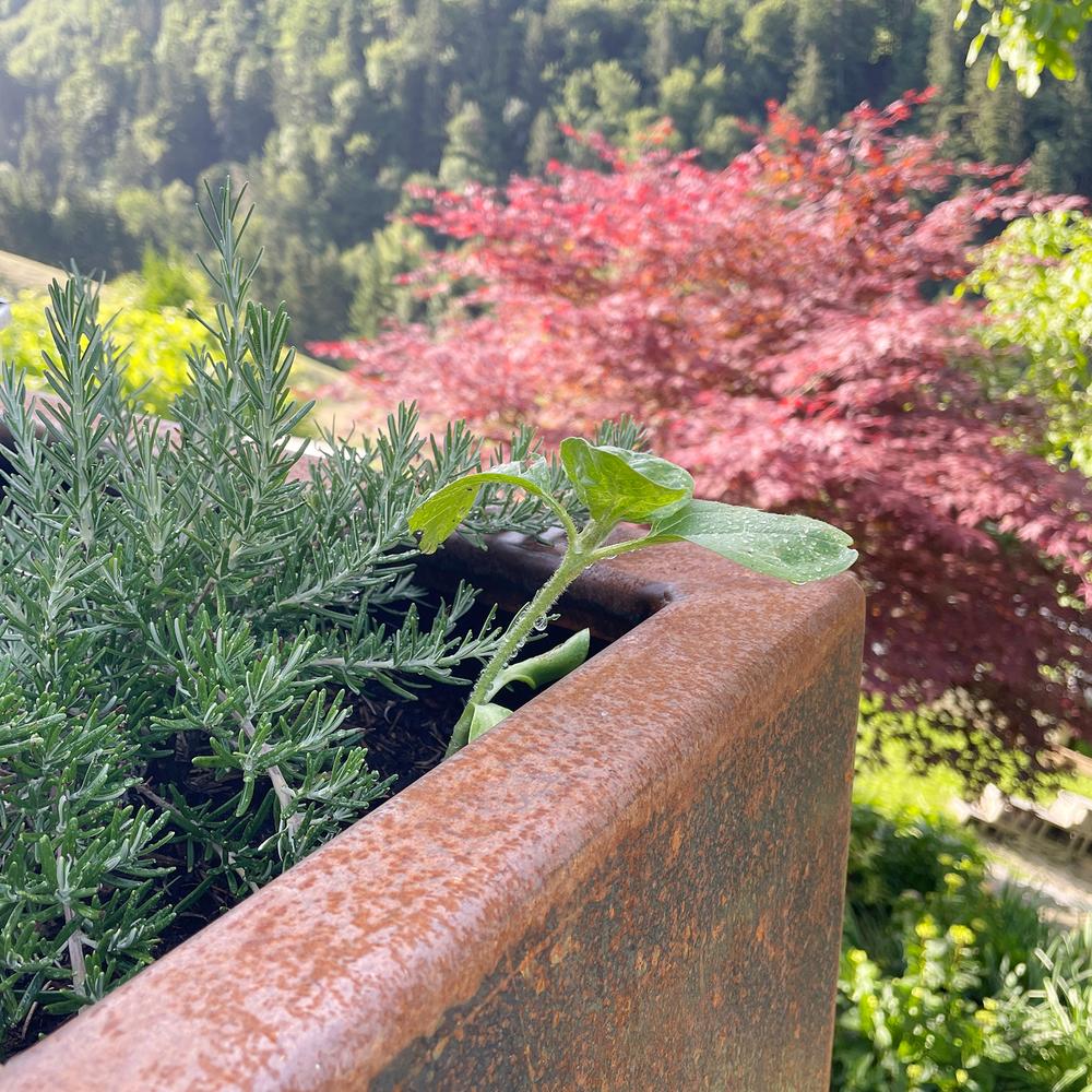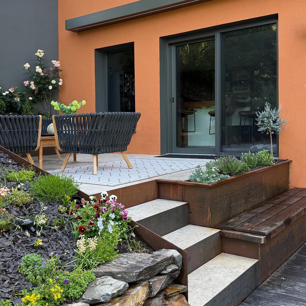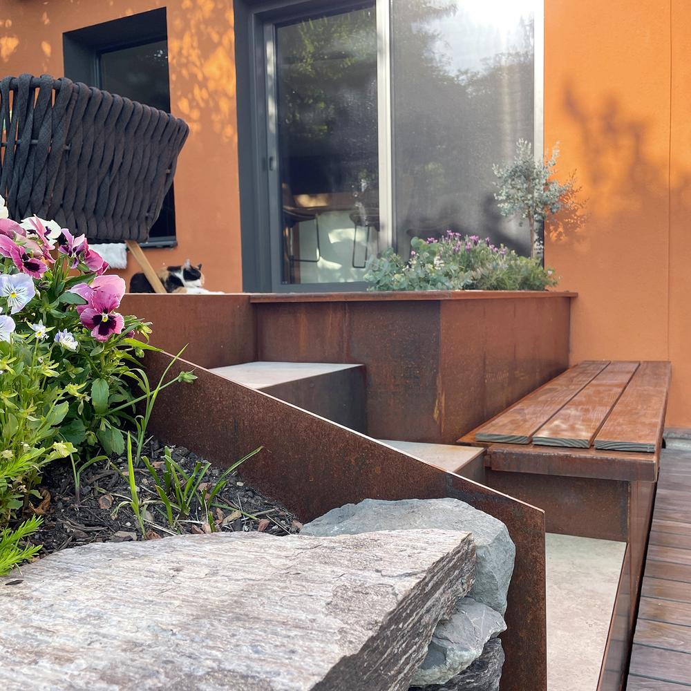 Minimalistisches Outdoor-Konzept in Hanglage: Hochbeete, Kompostverkleidung und Wasserbrunnen aus Cortenstahl, Edelstahl Brunnenbogen und Überlauf, Projektpartner Stahlelemente VMZ