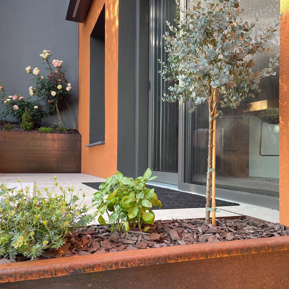 Ein neu gestalteter Parkplatz mit Pflastersteinen im Mittelsteinverband sowie Hochbeete, Komposter und Sichtschutz aus Cortenstahl mit individuellem Kunden-Emblem. Projektpartner Stahlelemente FS-Metalltechnik; Tiefbau und Pflasterarbeiten TF-Bau