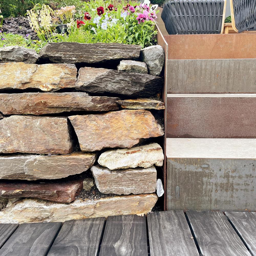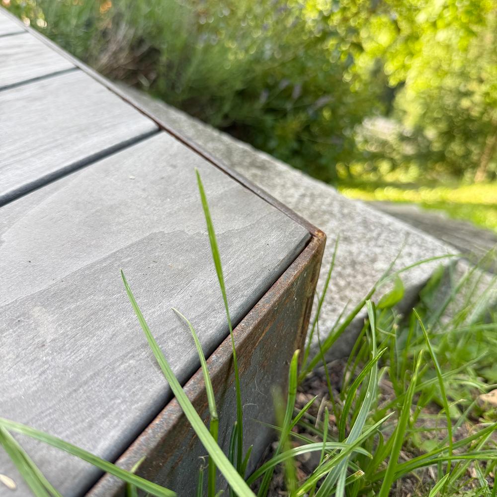 Designobjekt "steps" aus gekantetem Stahl feuerverzinkt, dekoriert mit Altholz und Zierkies - perfekt eingepasst zwischen Hausfassade und Stiegenabgang