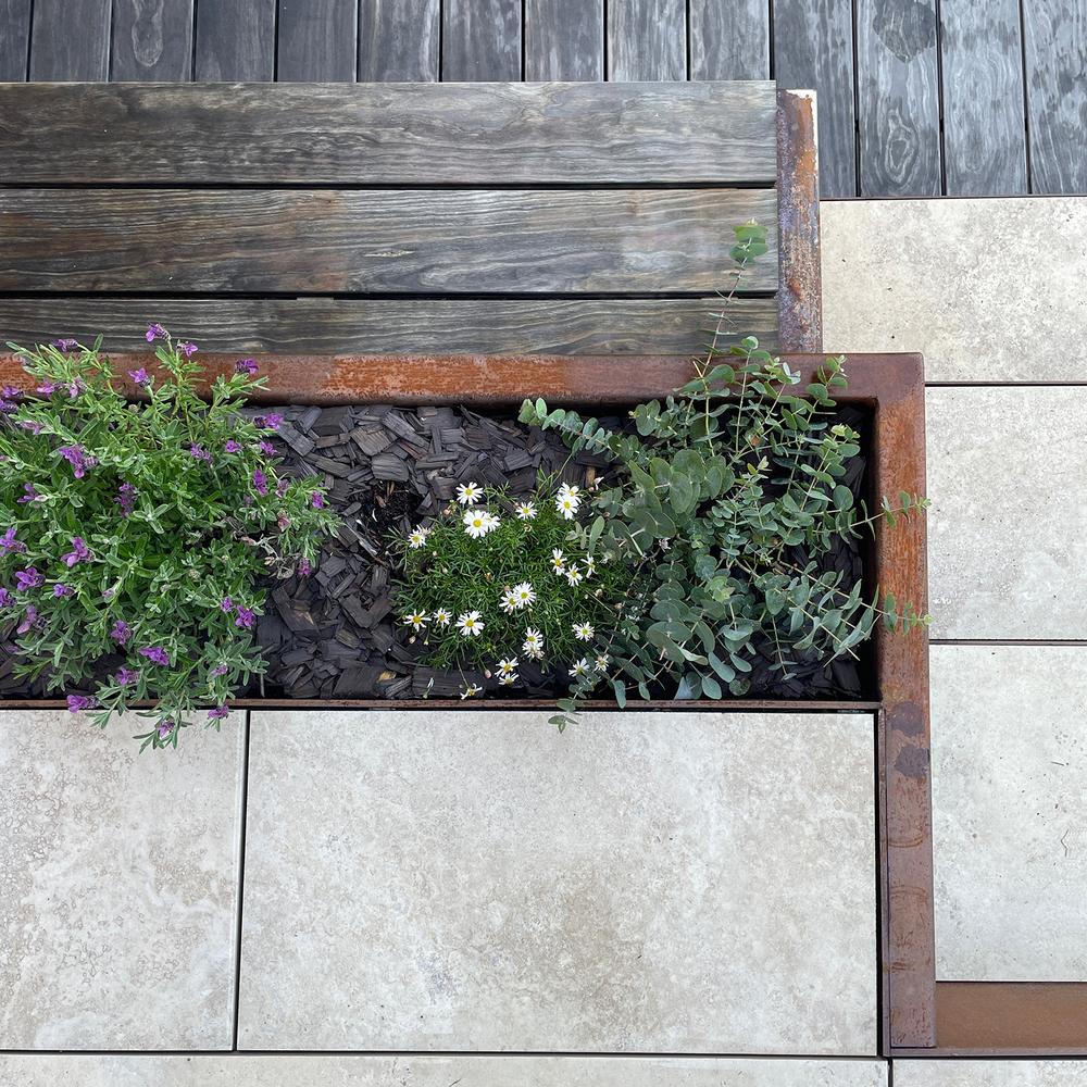 Maßgeschneiderte Outdoor - High Box aus Rohstahl mit Stauraum für Grill, Kühltonne und Gartengeräte. Ein optisches Highlight auf der Terrasse mit funktionalem Design, Projektpartner: VMZ