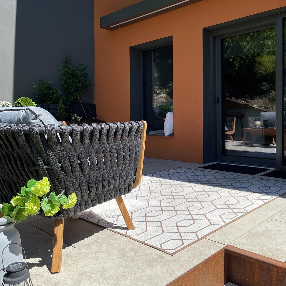 Individuell gestaltete Outdoor Möbel mit Formrohr-Blech Konstruktion in Rostoptik „ruggine“ - Highlight Drehschublade für maximale Zugänglichkeit.