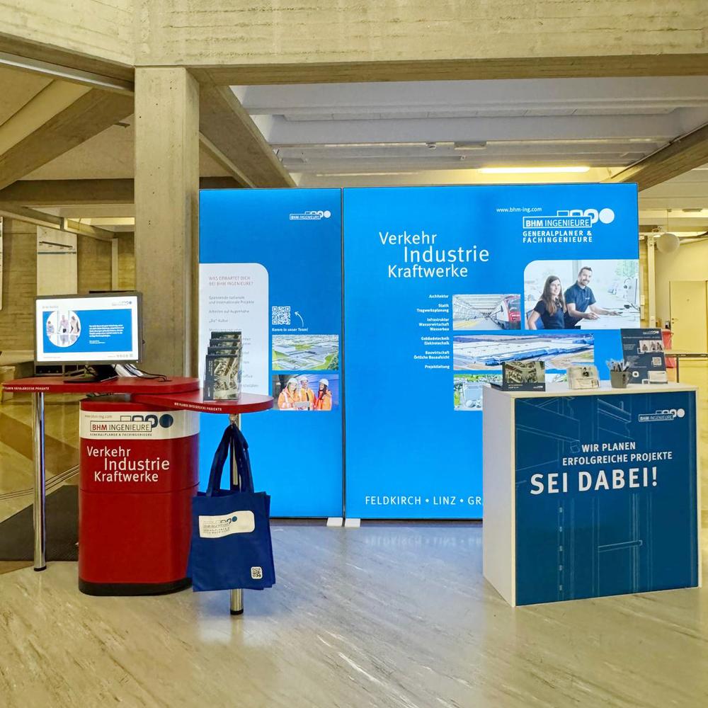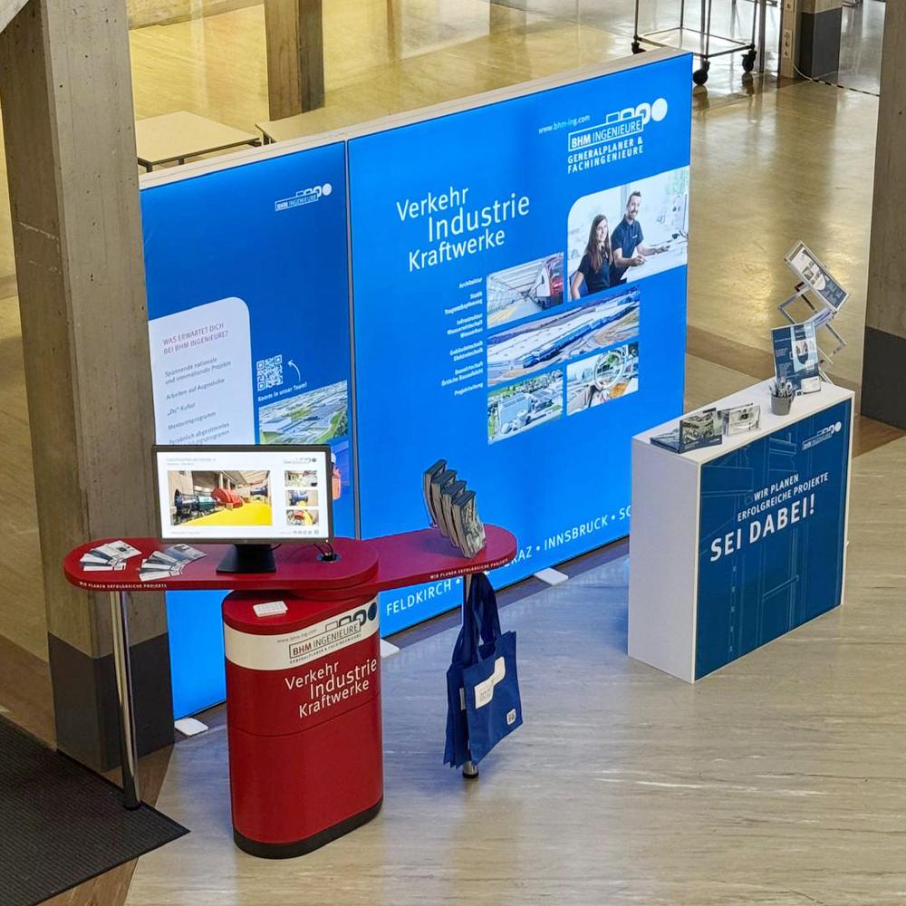 Konzept, Design, Planung und Gestaltung eines mobilen Messestandes für BHM Ingenieure aus Feldkirch, Projektpartner Messebau: Fairplay