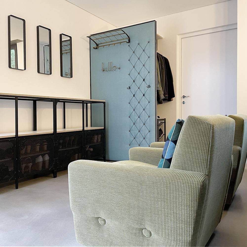 Design, Konzept, Planung und Organisation für individuellen Garderobenraum mit drehbaren Retro Sessel und Garderobenmöbel im 50er Vintage Stil, Projektpartner Gussboden alex malerkiste, Stahlmöbel VMZ